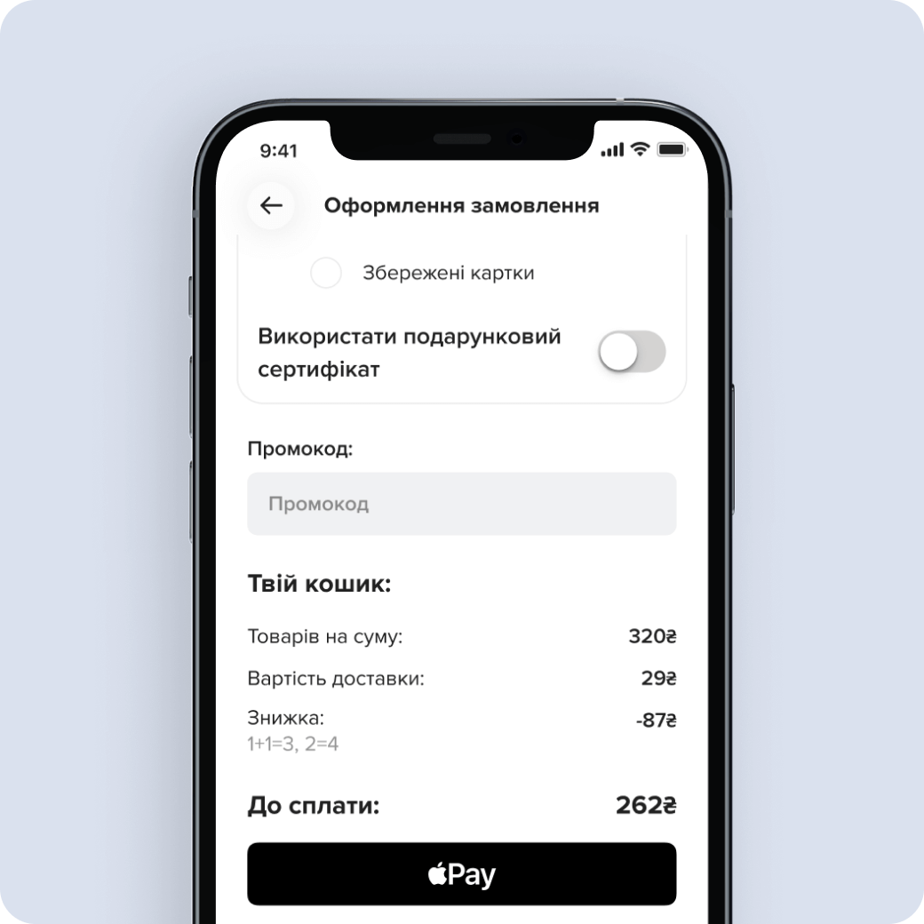 Обирай, замовляй і плати, як зручно — при отриманні, карткою або через Google Pay / Apple Pay.
